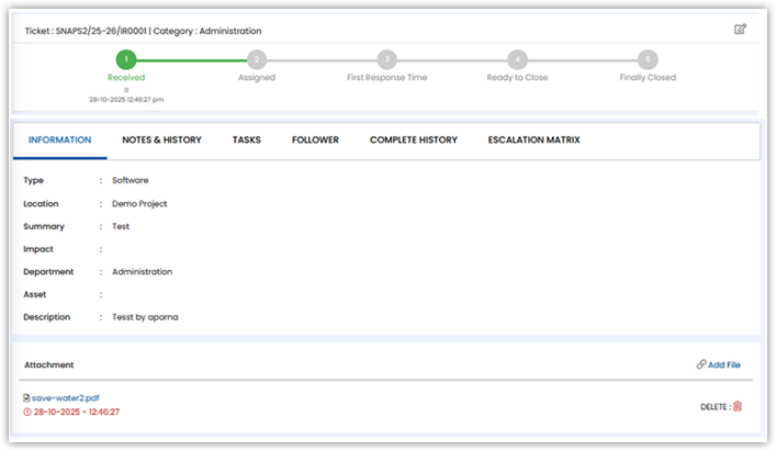 Create, edit and search tickets by Project, Unit, Category & Priority with access control.